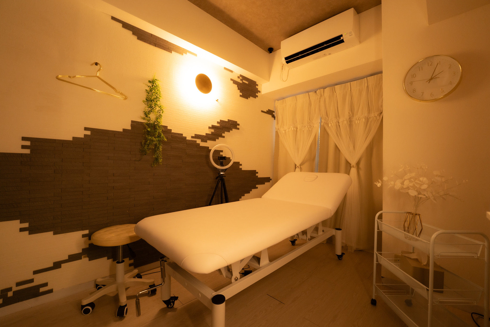 施術用ベッド、落ち着いた雰囲気でエステ、整体、リラクセーションに最適なスペース