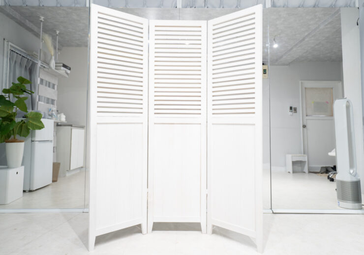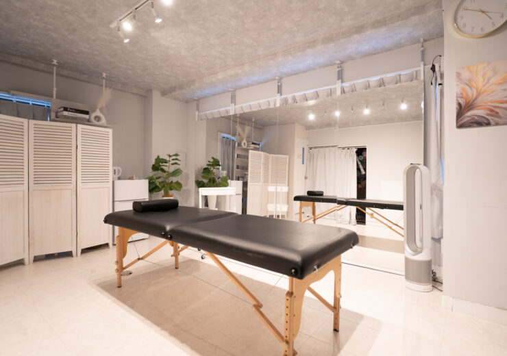 ドレッサー、施術用ベッド、ヨガマット、パーテーションあり